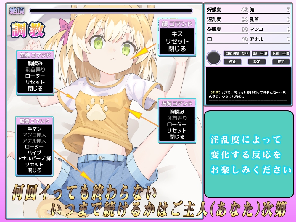 ・提升淫乱度和各项能力值后,可进行的调教或恶作剧内容将会增加。 此外,购买成人用品后,也能在调教中使用。