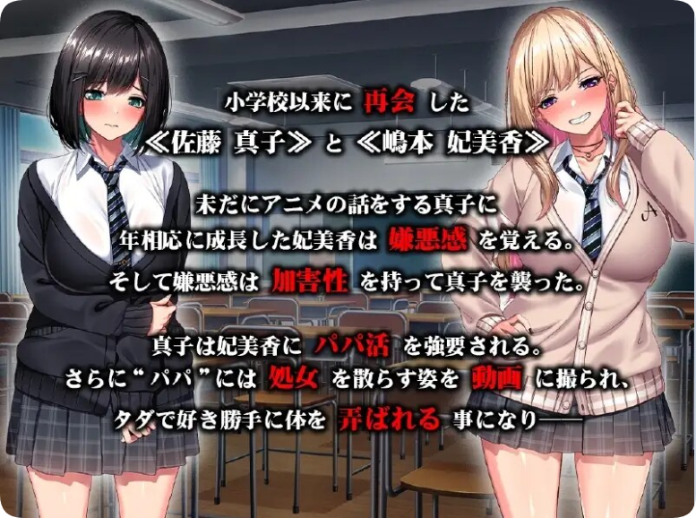 真子在妃美香的命令下,被迫去见那些“爸爸”,在那儿她失去了童贞,并被拍下了羞耻的视频。